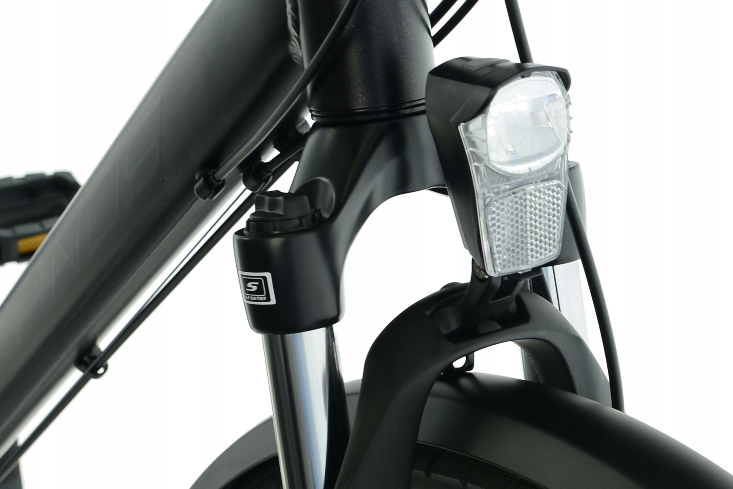 Dla dodatkowego komfortu na nierównym podłożu amortyzator SR SUNTOUR o skoku 63 mm skutecznie tłumi wstrząsy, a 28-calowe koła z oponami IMPAC szerokości 4,5 cm zapewniają doskonałą przyczepność i zwiększoną odporność na przebicia. Mocne i precyzyjne hamulce dają niezbędną kontrolę, aby jeździć bezpiecznie, niezależnie od trasy.